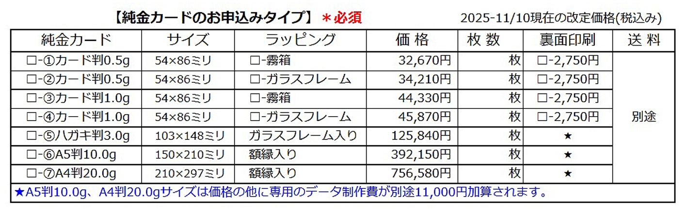 ➁純金ギフトカード:1-名刺サイズのギフトカード、2-はがきサイズのガラスフレーム入り、3-A4サイズの額入り