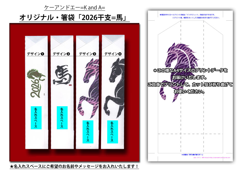 ケーアンドエーでは、2026年の干支「午(うま)」をテーマに、心を込めたオーダーメイド・グッズを製作・販売いたします。伝統と現代の美を融合させた、唯一無二の逸品をぜひお楽しみください。